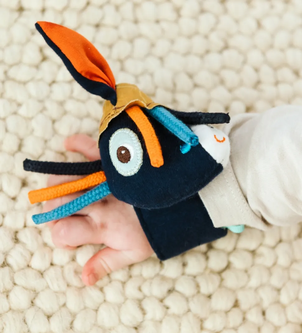 Lilliputiens ranglen laver en raslende lyd, når barnet bevæger den. Armbåndet har velcrolukning og i øvrigt knitrepapir indvendigt, så det også giver lyd fra sig.