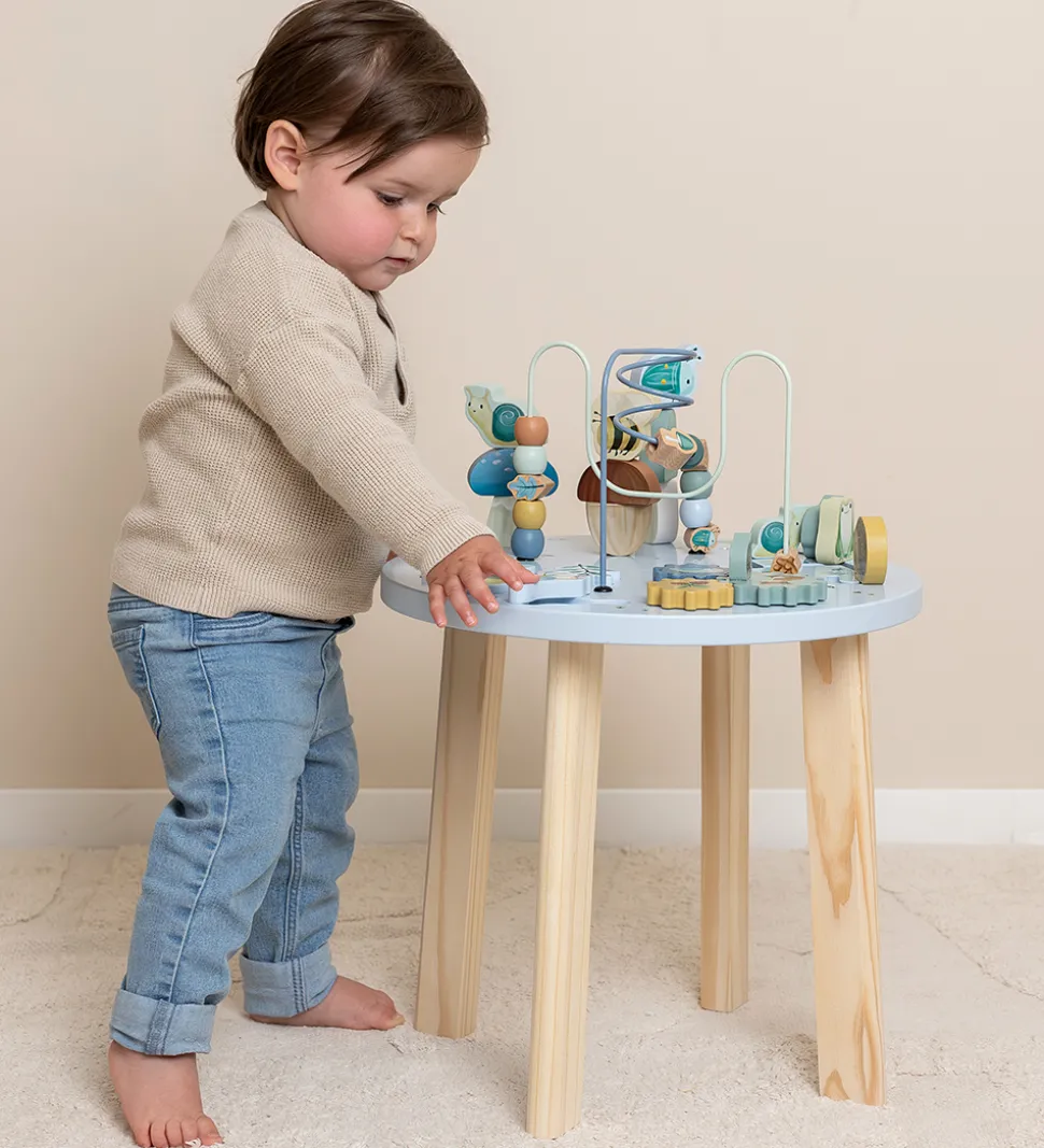 Sødt Little Dutch aktivitetsbord i blå farver. Aktivitetsbordet indeholder en masse sjove aktiviteter for barnet og har et hyggeligt skovtema.