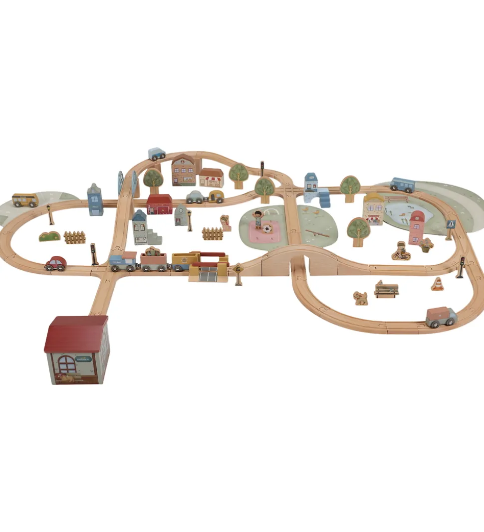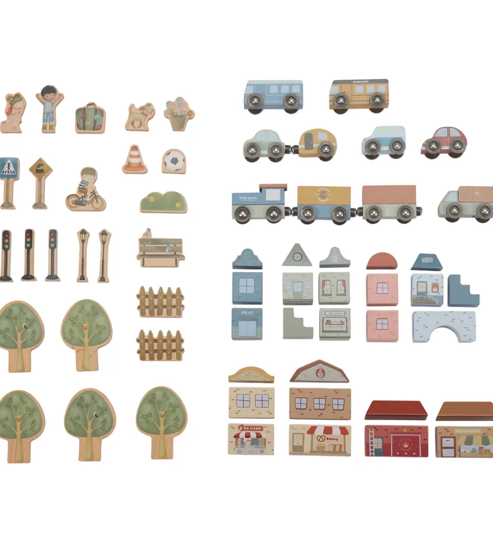Charmerende Little Dutch bilbane i naturlige træfarver med små, farverige tilbehørsdele såsom biler, huse og træer. Little Dutch bilbanen tilbyder en hyggelig legeoplevelse med et flot bymiljø, som inspirerer til kreativ leg.