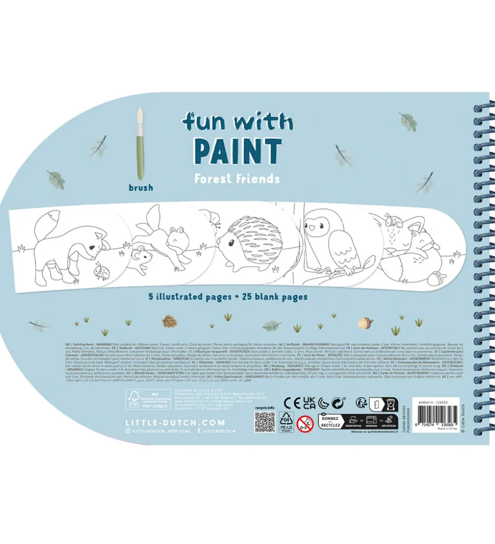 Little Dutch malebogen inkluderer fem sider med tegninger, som kan males og 25 blanke sider. Malebogen har fire vandfarver og kommer med en pensel. Malebogen er perfekt til kreative stunder.