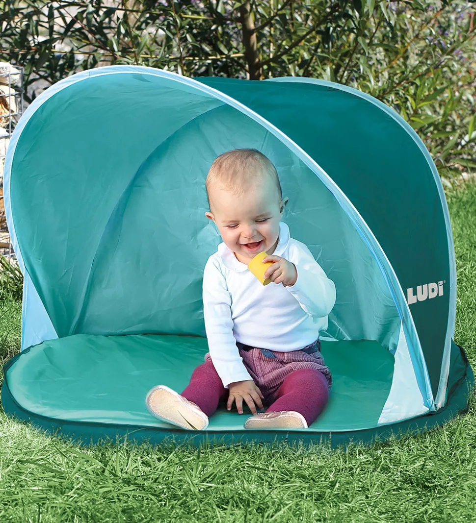 Ludi syggeteltet er perfekt til stranden eller haven, når baby har brug for et skygge sted. Teltet har en smart detalje i bunden, hvor man kan hælde vand i, så baby kan plaske rundt og køle ned i varmen.