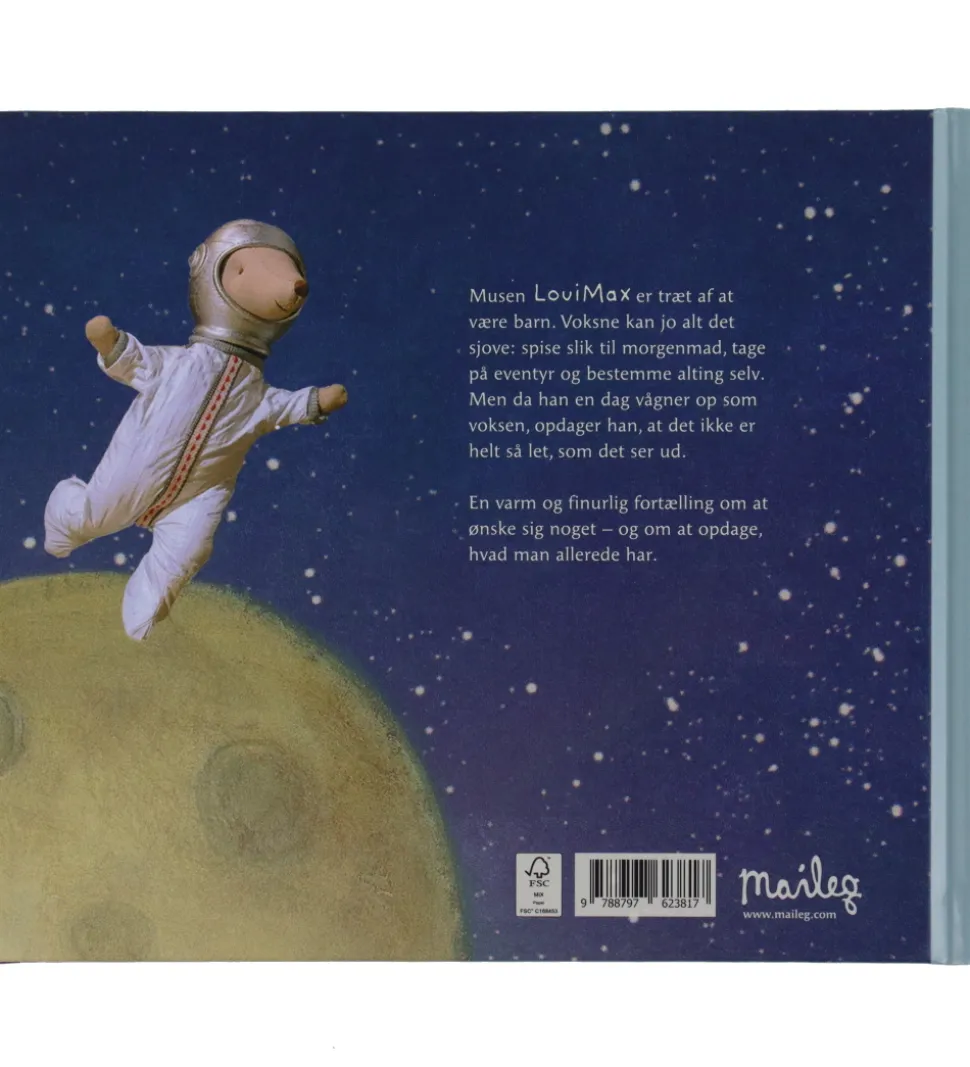 Mailegbogen er indbundet og rummer 58 sider, der fortæller en historie om Louimax, der ønsker sig at være voksen.