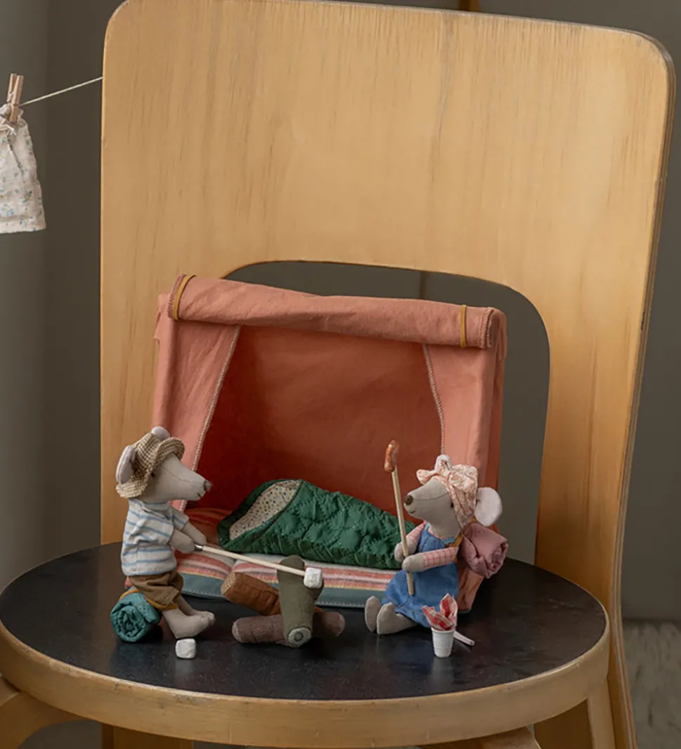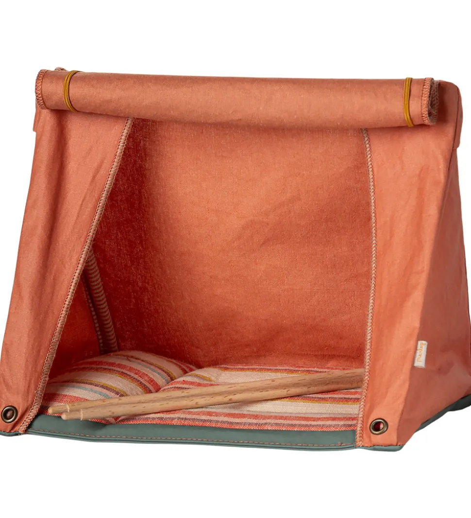 Maileg teltet er perfekt, når den lille musefamile skal på campingtur. Bunden er vatteret, så de ligger godt, og der medfølger et blødt tæppe. Den ene side på teltet kan holdes åben, så teltdugen danner et halvtag.