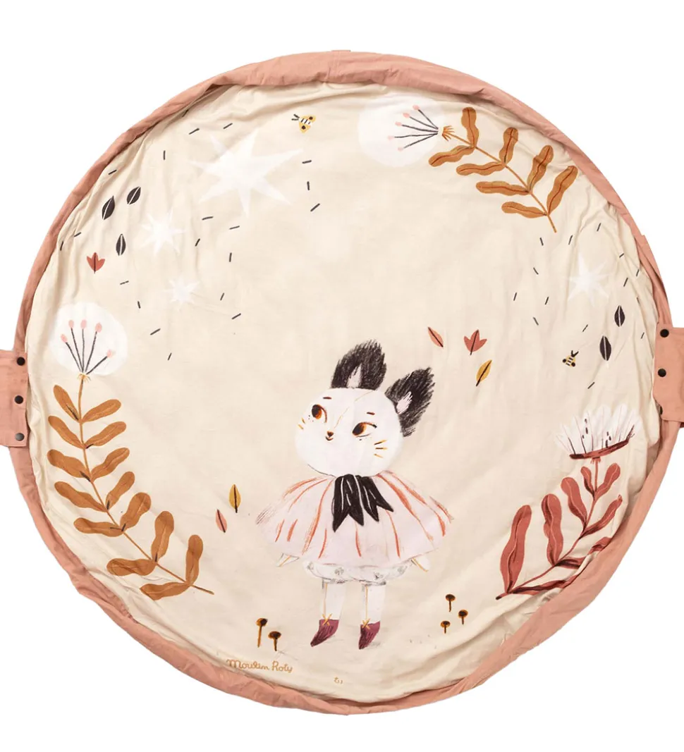 Flot Play&Go x Moulin Roty legetøjstæppe i cremehvid med rosa kanter og med forskellige print på inder- og ydersiden. Indersiden har et pritn af en sød kanin i fint tøj og med blomster, mens ydersiden har et alloverprint af lysebrune grene med mørkeblå bær.