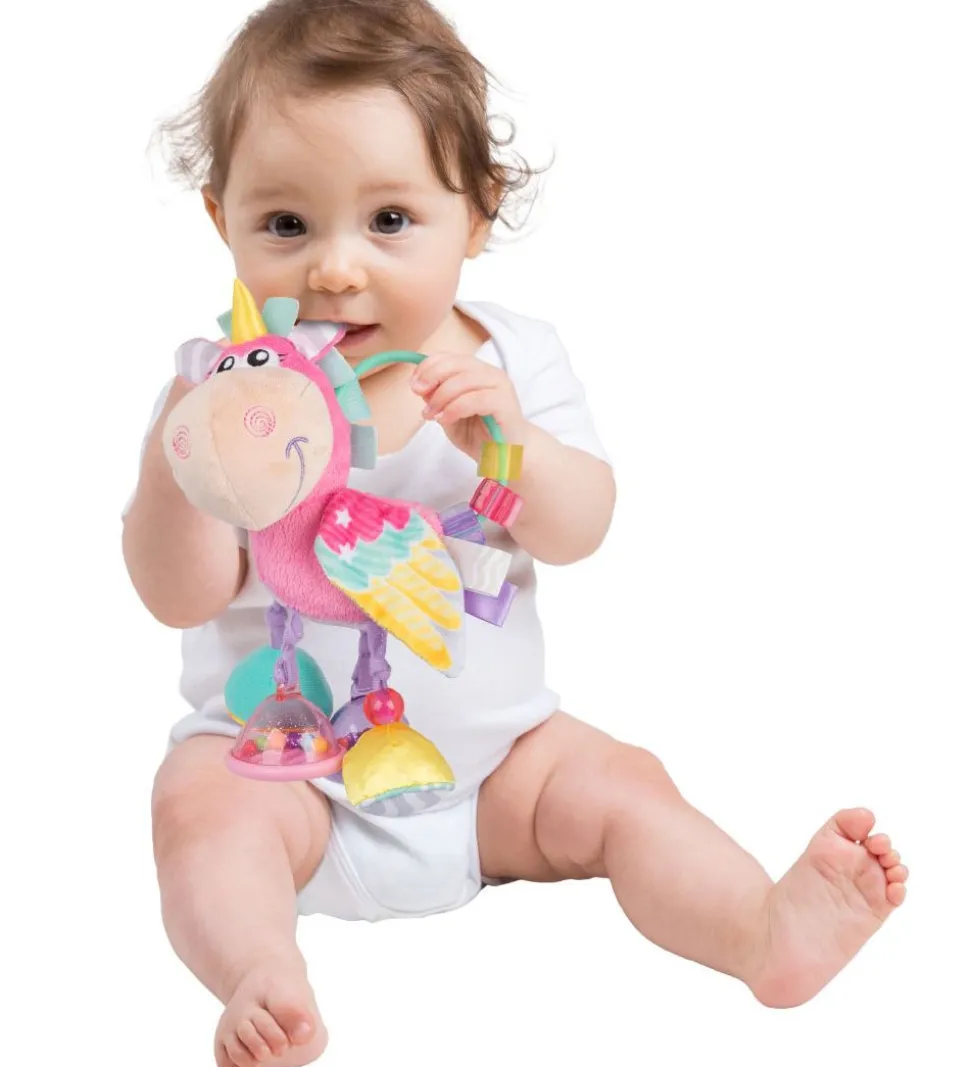 Sjov Playgro aktivitetsrangle med form som en pink enhjørning, med detaljer i regnbuens farver.