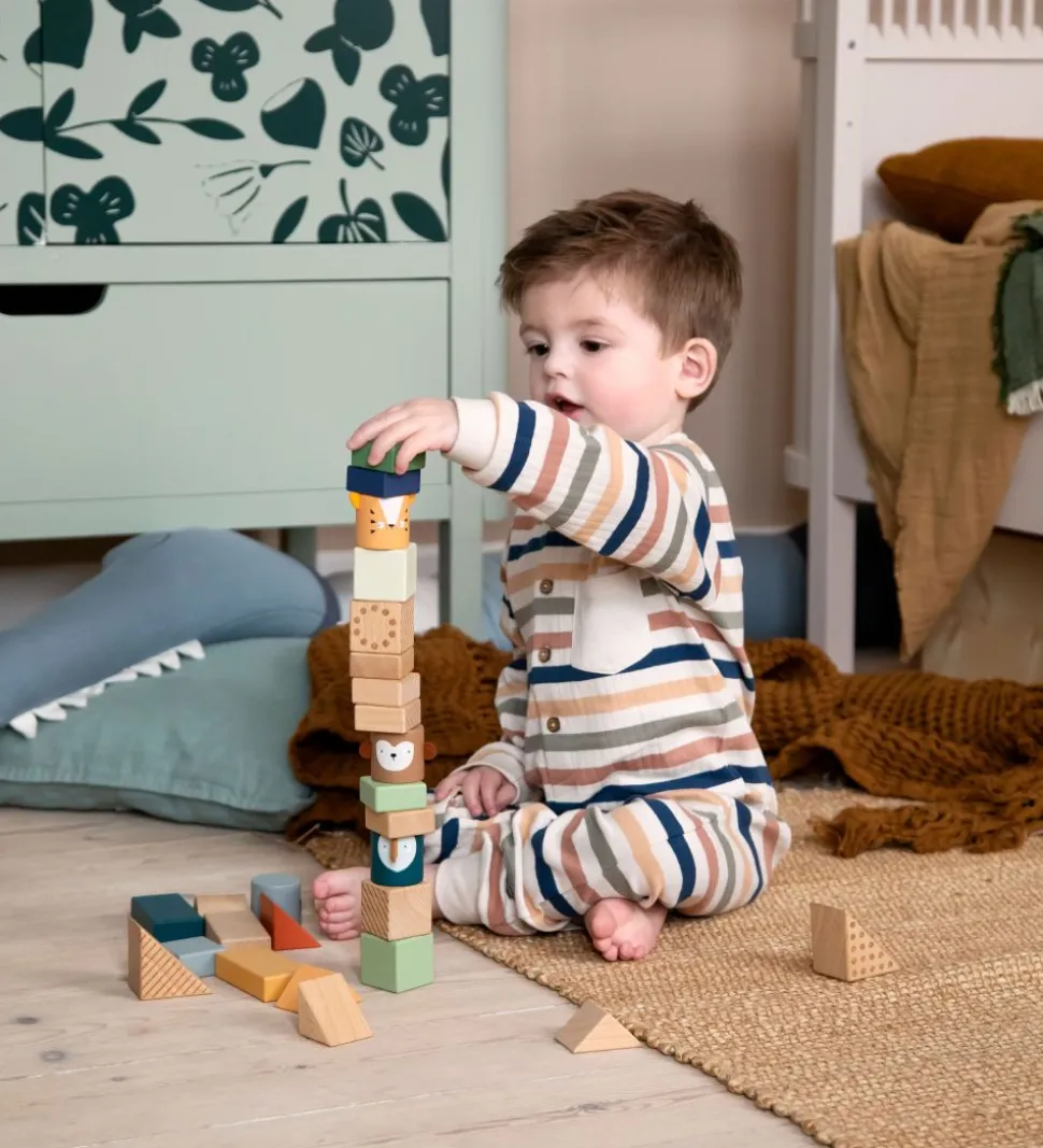 Skønt Sebra byggeklodser i farvet træ med byggeklodser i firkanter, trekanter, broer og dyrehoveder – aben Maci, tigeren Tupi, tukanen Tully og dovendyret Lacey.