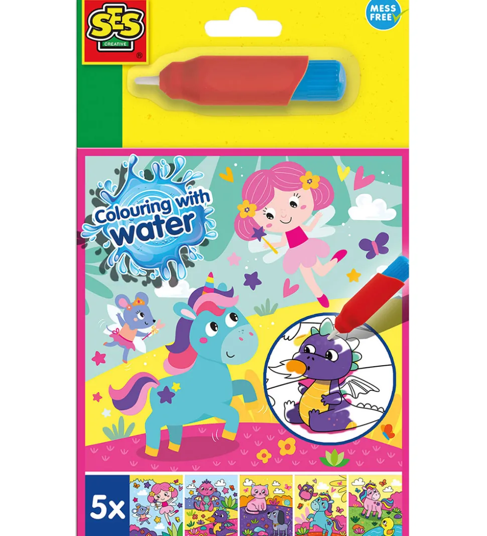 Farverig SES Creative malebog med søde illustrationer og vandfarvepen. Bogen indeholder fem forskellige motiver, herunder en unicorn og en drage, perfekt til kreative stunder. Ideel til små kunstnere.