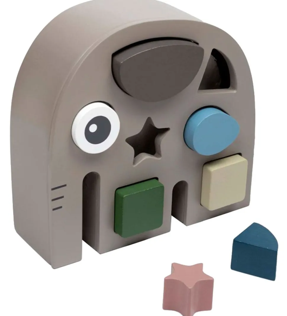 Underholdende Smallstuff puttekasse i gråt træ med form som en elefant.