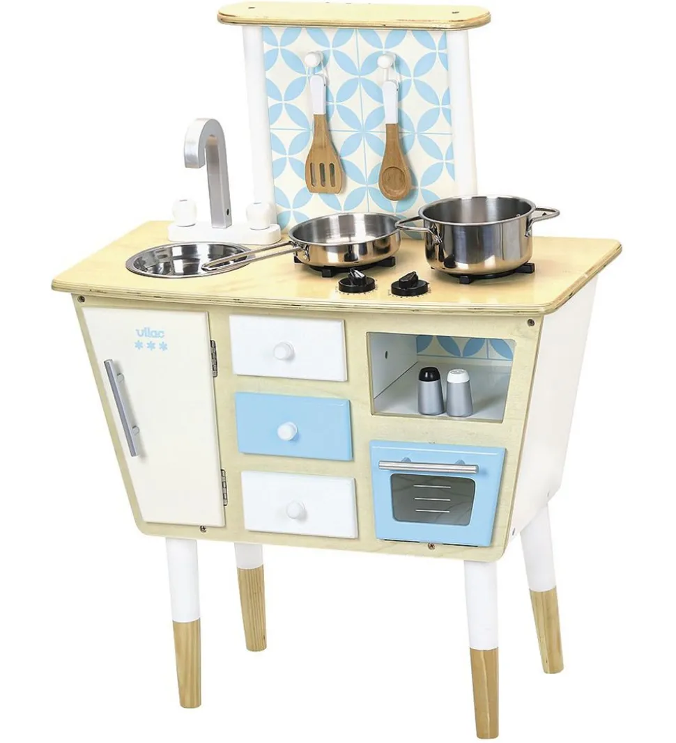 Vilac køkkenet er fuld udstyred med ovn, håndvask, kogeplader og opbevaringsplads, samt knager til redskaber. Både skabene og ovnen kan åbnes. Knapperne til kogepladerne kan drejes og når dette gøres, siger de klik-lyde.