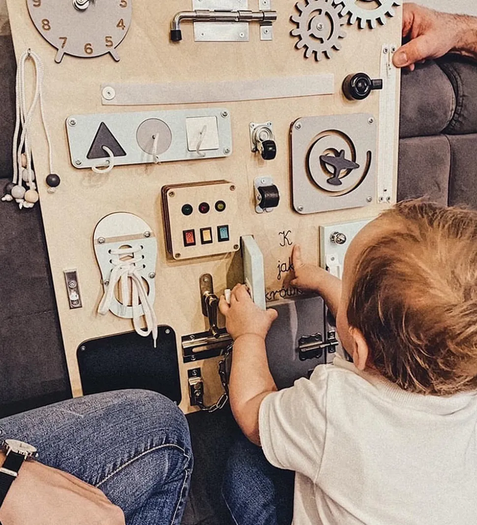 Woobiboo Woobiboardet er en aktivitetstavle, som kombinerer læring og leg. Den er designet til at vække barnets nysgerrighed og gennem leg styrke en række færdigheder. Woobiboardet styrker motorikken og logisk tænkning samt barnets uafhængighed, tålmodighed og psykomotoriske færdigheder. Woobiboardet rummer følgende aktiviteter: