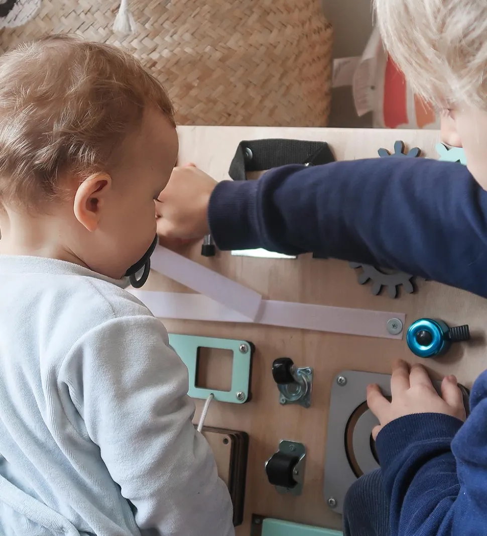 Sjovt Woobiboo Woobiboard i træ, som er fyldt med spændende aktiviteter, der er malede i mintblå og grå farver.